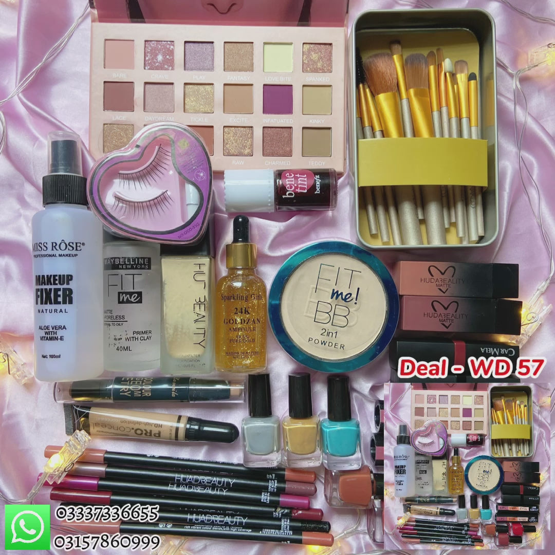 Mega makeup bundle Pakistan, Huda Nude palette Pakistan, LA Pro concealer price in Pakistan, Naked brush set Pakistan, Huda faux filter foundation, Fit Me baby skin primer, Benetint Pakistan, Goldzan serum, Miss Rose nail paints, bridal makeup set Pakistan, Dubai imported cosmetics Pakistan.