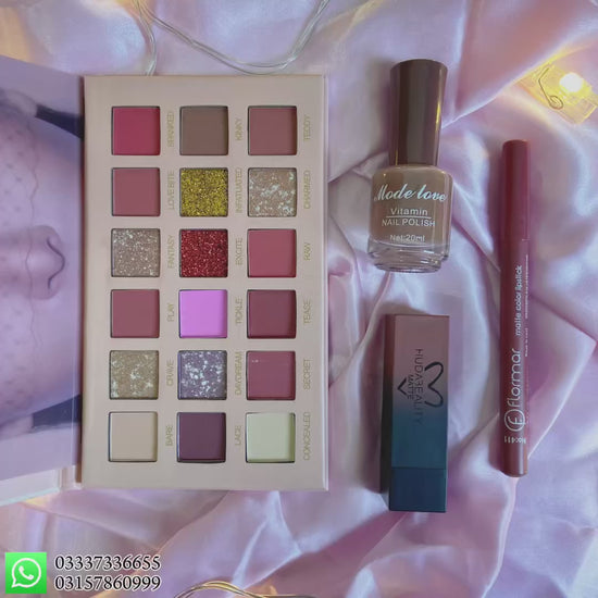 Step into elegance with our Nude Deal, a premium 4-in-1 makeup bundle featuring the essentials every makeup lover needs. This set includes the Huda Nude Eyeshadow Palette, a versatile mix of matte and shimmer shades perfect for soft glam or bold smokey eyes. Pair your eye look with the Nude Lip Liner for precise definition, and glide on the Nude Lipstick for a chic, long-lasting pout. To complete the look, add a touch of sophistication with the Nude Nail Paint, giving your hands the perfect polished finish.